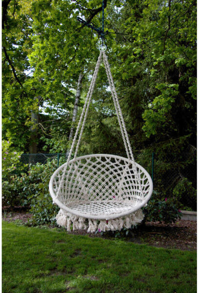 A kézzel kötött természetes pamutból készült Hamaka makramé hintaszékben zavartalanul pihenhet otthon vagy a kertben. A Hamaka Macramé függőszék természetes pamutból készült. A kézzel kötött minta romantikus hangulatot áraszt, és otthonra és kertbe egyaránt alkalmas. Az acélkarikák biztosítják a stabilitást, és Ön zavartalanul élvezheti a pillanatot.