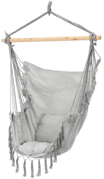 Puerto Függőszék – Igazi kényelem a kertben Termék nevePuerto FüggőszékSzínSzürkeAnyag330gsm poliészter-pamutTömőanyagSzórt pamuttal töltveDekorációBojttal díszítveMéretek130 x 100 cm A Puerto függőfotel kiváló választás, ha az otthoni kikapcsolódásra vagy egy stílusos kültéri kiegészítőre vágysz. A 330gsm poliészter-pamut anyagú párnákkal, minőségi tömőanyaggal, és díszes bojttal ellátva a Puerto függőszék nemcsak esztétikus, hanem rendkívül kényelmes is. Teljes körű kényelem A Puerto függőfotel tervezése során kiemelkedő figyelmet fordítottak a kényelemre. A 270 fokban körbeölelő kialakítás tökéletesen alátámasztja a testet, miközben a könnyen eltávolítható és alacsony hőfokon mosható párnahuzatok egyszerűsítik a karbantartást. Környezetbarát és tartós A Puerto függőfotel aktív nyomtatási és festési technológiával készült, ami nem csak a környezetre gyakorolt hatást minimalizálja, hanem garantálja a színek hosszantartó élénkségét is. A gondosan megválogatott anyagok és a precíz varrás garantálja éveken át tartó használatot. Könnyen telepíthető függőszék A Puerto függőfotel kiemelkedik egyszerű használatával, hiszen csak egyetlen rögzítési pont szükséges. Ez teszi lehetővé, hogy a széket könnyedén mozgasd a balkonról a teraszra, vagy akár a gyerekszobába. Rugalmas elhelyezés Legyen szó kültéri relaxációról vagy beltéri kényelemről, a Puerto függőfotel tökéletes választás. Könnyen függeszthető a kert vagy udvar faágaira, és ugyanolyan egyszerűen integrálható a verandára, balkonra vagy a nappaliba. Termékméret: