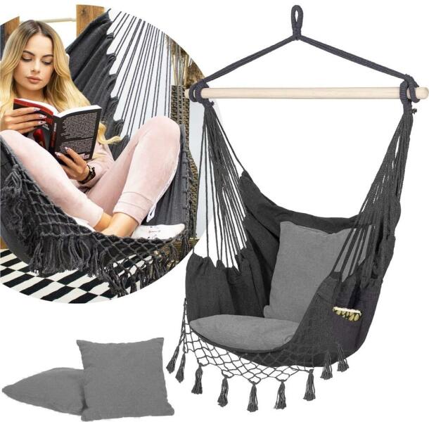 Springos Függőfotel: Pihenés és kényelem a szabadban ☀️ Élvezze a nyugalmat és a kényelmet ezzel a gyönyörű Springos függőfotellal! Tökéletes választás a kertbe, teraszra vagy erkélyre, ahol kellemesen ellazulhat a napsugarakban. A puha pamut anyagból készült fotel kellemes légáramlást biztosít, a két puha párnával pedig maximális kényelmet élvezhet. Főbb jellemzők:Kényelmes és tágas: Bőséges helyet biztosít a pihenéshez, olvasáshoz vagy egyszerűen csak a környezet élvezetéhez. Tartós és időtálló: Minőségi anyagokból készült, így hosszú éveken át szolgál majd. Könnyű és hordozható: Könnyen mozgatható és tárolható, így bárhol élvezheti a pihenést. Divatos dizájn: A csinos rojtok és a modern szürke szín stílusos kiegészítője lesz otthonának. Praktikus zseb: Kényelmesen tárolhatja benne könyvét, telefonját vagy más apróságokat. Két puha párna: A maximális kényelem érdekében két párna is jár hozzá. Maximális teherbírás: 150 kg Méretek:Tulajdonság MéretSzélesség 130 cmMagasság 100 cmPárna mérete 40x40 cmAnyag: 65% pamut + 35% poliészter Lepje meg magát ezzel a kényelmes és stílusos függőfotellal, és élvezze a pihenést a szabadban!
